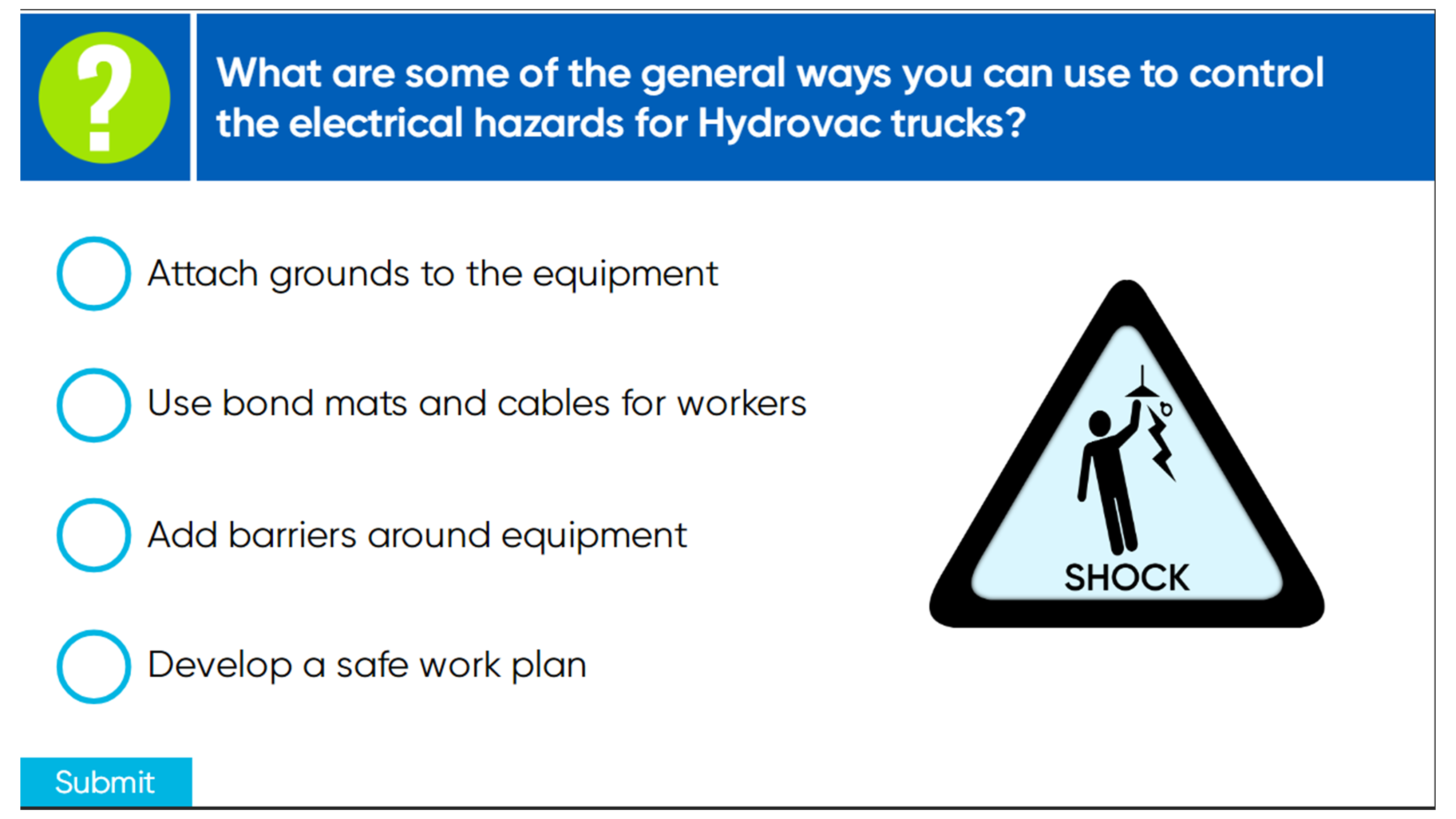 Improve safety culture and operational efficiency with our interactive course on Equipotential Bonding for Hydrovac Operators. Designed for teams working near underground and overhead high-voltage power lines, this training equips learners with practical knowledge to identify electrical hazards and apply safe excavation techniques.
